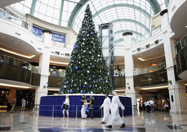 DUBAI, UNITED ARAB EMIRATES – DECEMBER 12: Men in traditional clothes walk past a giant Christmas tree in the Mall of the Emirates, one of the largest malls in the world on December 12, 2006 in Dubai, United Arab Emirates. Recent debates in the United Kingdom have arisen around whether Christmas trees should be put up in public places for fear of upsetting non-christians, while in Dubai, an arabic society, the Christmas tree takes centre stage in the mall. (Photo by Chris Jackson/Getty Images)